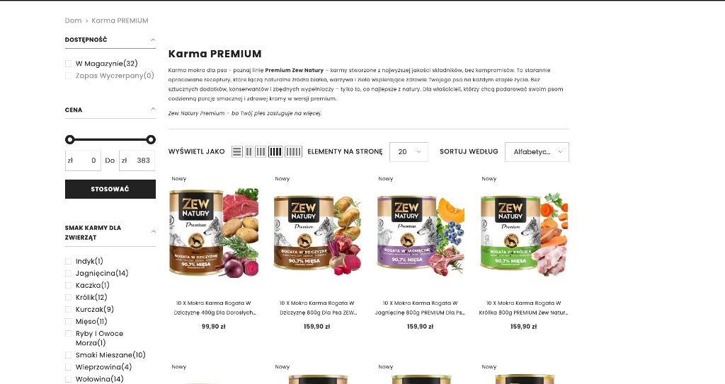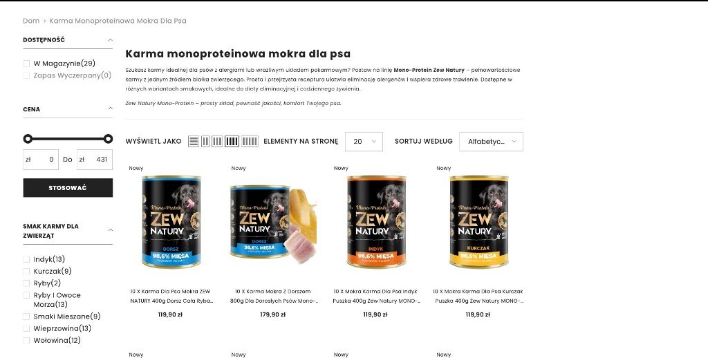 ZEW NATURY tworzy mokre karmy monoproteinowe oparte wyłącznie na czystym mięsie z jednego gatunku – np. indyku, jagnięciny czy dziczyzny. To produkty bez mieszanek nieokreślonych mięs ani produktów ubocznych, dzięki czemu są lekkostrawne, bezpieczne i dobrze przyswajalne.